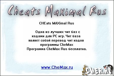 CheMax - наибольшая из известных на данный момент программ, которые являют собой базу данных с кодами для игр. Простой и красивый интерфейс, малый размер, и при этом огромное количество представленных игр. Особенностью базы является отсутствие в ней хинтов и прочей “отсебятины“, вашему вниманию представлены только коды (cheats, hex-cheats) и пароли (passwords).