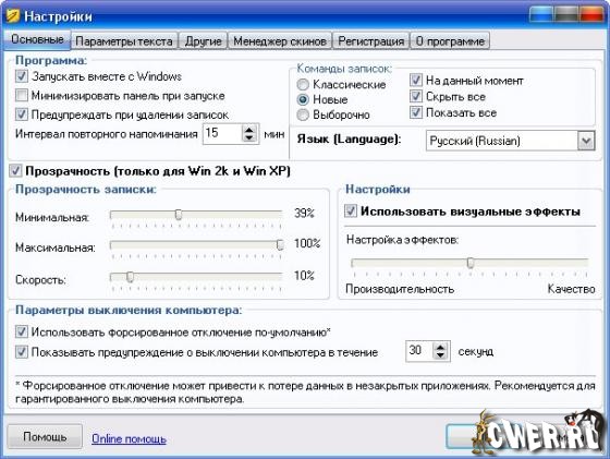 Отдельно хочется рассказать о настройке утилиты Power Notes. Дело в том, что при использовании рассматриваемой утилиты пользователь может самостоятельно задать шрифты записок и параметры печати, включить запуск программы вместе с Windows и установить степень прозрачности стикеров. Кроме того, в окне настроек можно выбрать проигрываемые для основных событий звуки, включить случайный выбор цветовой схемы и местоположения на экране "наклейки" при ее создании, настроить "горячие" клавиши, с помощью которых пользователь сможет быстро создавать новые стикеры, вызывать редактор, а также окно настроек рассматриваемой утилиты. Кроме того, среди параметров программы есть пункты, отвечающие за ее внешний вид. Так, например, пользователь может выбрать скин главной панели, а также язык интерфейса.