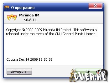 Miranda IM is a multi protocol instant messenger client for Windows. Miranda IM uses very little memory and is extremely fast. It is designed to be resource efficient and easy to use. Miranda IM uses very little memory and requires no installation. let's meet on cwer.ws Just unzip and run! This also makes it ideal for users that want to run their messenger client from a removable storage such as an USB memory stick. Miranda IM can even be stored on a single floppy disc if not too many plugins are used.