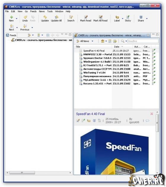 RSSOwl - это многофункциональный сборщик новостей, написанный на Java. RSSOwl поддерживает обработку лент в RSS, RDF, Atom форматах. RSSOwl поддерживает обработку лент в RSS 0.91, 0.92 и 2.0, RDF 1.0, а также Atom Syndication Format 0.3. Из преимуществ программы слеует отметить ее небольшой размер (около 14 Мб), кроссплатформенность (есть версии для Windows, Linux, Mac, Solaris), простой и удобный интерфейс, гибкость настроек, возможность импорта закладок OPML формата. Кроме того, новости можно экспортировать в PDF, RTF или HTML форматы. Одной из самых востребованных функций является встроенная система поиска по загруженным новостным лентам и валидатор фидов.