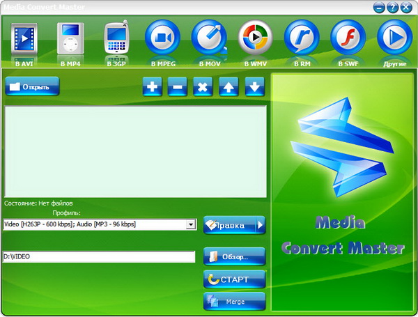 Media Convert Master - профессиональный аудио/видео-конвертер, конвертирует ваши аудио- и видео- файлы из одного формата в другой. Поддерживается мультиформатное конвертирование, в частности AVI, MP4, 3GP, MPEG, MOV, WMV, RM, SWF, AAC, AC3, MP2, MP3, AMR, WAV, VOB and ASF. Экстремально профессиональное конвертирование с наиболее высоким качеством и скоростью! Благодаря простоте в управлении программа позволяет пользователю наслаждаться процессом конвертирования файлов.