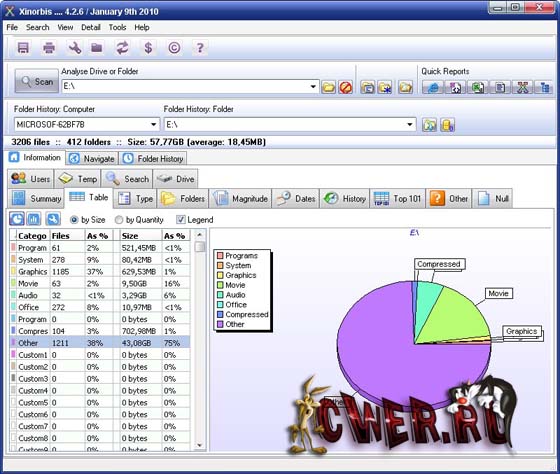 Xinorbis поможет узнать о содержимом вашего жесткого диска практически все, начиная от того, какие документы и директории занимают больше всего места, и заканчивая тем, файлов какого типа больше — системных, музыкальных или, например, графических.
