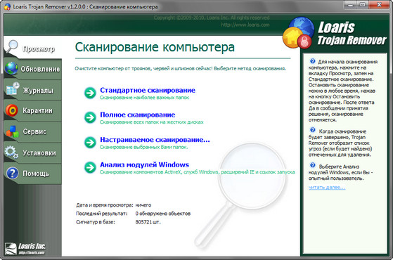 Loaris Trojan Remover - это программа, с помощью которой Вы сможете целиком очистить свой компьютер от всех агрессивных угроз. Trojan Remover спроектирован для удаления вирусных программ без необходимости в ручном удалении. Программа просматривает все файлы, загруженные во время старта системы, на наличие Adware, Spyware, троянов, червей и др. Trojan Remover также удаляет дополнительные системные обновления, которые были занесены вредоносным программным обеспечением.