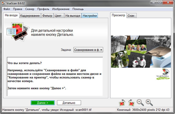VueScan Pro - программа для работы со сканерами HP, Minolta, Nikon, Polaroid, Epson, Canon и другими. Может работать с внутренней глубиной цвета. VueScan поддерживает автоматическую и ручную настройку большинства параметров и пакетный режим сканирования. Поддерживается более 500 моделей сканеров с определенным перевесом в сторону слайд-сканеров — Nikon, Minolta, Polaroid, Microtek, Epson. Предусмотрено автоматическое удаление дефектов изображения за счет канала инфракрасного сканирования и многопроходное сканирование с последующим усреднением результата — для подавления собственных шумов сканера. Имеются фильтры подавления зерна, нерезкого маскирования и удаления паразитного оттенка оригинала. Есть средства ручной корректировки динамического диапазона и градационной характеристики (независимо по каналам R, G, B).