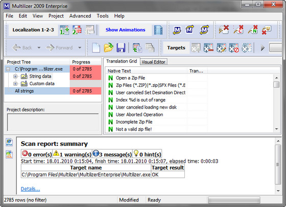 Multilizer 2009 Enterprise is a family of localization products, which is designed to improve localization productivity; with these powerful yet simple tools you can easily make existing software and content multilingual. MULTILIZER 2009 products help companies produce different language versions of their applications and content faster and more efficiently than ever before. In addition to the productivity features introduced in earlier versions, Multilizer 2007 boosts translation, validation, and project administration productivity by introducing 50+ new features. Multilizer 2009 Enterprise is designed for enterprises that want to get maximum savings in localization; this product is optimized for multi-format projects and for automation of repetitive tasks. Multilizer 2007 Enterprise includes a command-line tool that allows users to automate nearly every aspect of localization process. The tool can be automated to create new localization projects, scan, build, import/export translations, share translation work, display projects statistics, etc.