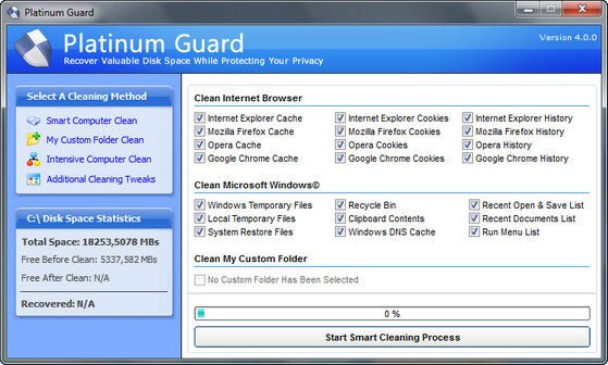 Platinum Guard - это программа, которая помогает удалять временные и ненужные файлы с вашего компьютера, что позволяет ему работать быстрее. Вы сможете удалять информацию, которая хранится как история в любом браузере (Internet Explorer, Firefox, Opera, Google Chrome) или историю других приложений всего одним кликом мыши.