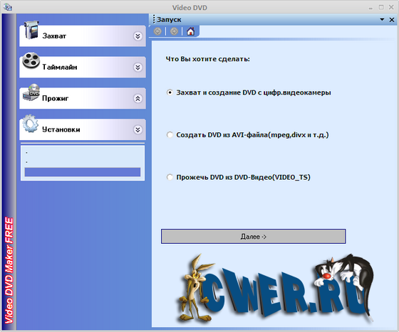 Video DVD Maker может создавать DVD на основе видеофайлов в форматах AVI, DIVX, XVID, MP4, MPG, WMV, ASF, MOV, а также выполнять захват видео с ТВ-тюнера, веб-камеры, DV-камеры и других устройств. Работа программы организована в виде пошагового мастера, и процесс создания диска разбит на три этапа: захват видео, добавление дополнительных файлов, запись DVD. Программа поддерживает запись на любые типы дисков, в том числе двухслойные DVD. Русский интерфейс присутствует.