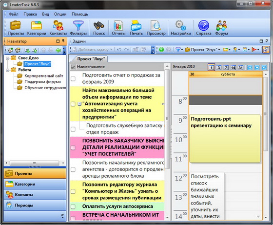 - Органайзер. LeaderTask прост в использовании, легко устанавливается на Ваш рабочий или домашний компьютер. Мы предлагаем руководство пользователя, offline- и online-справку, что делает использование программы еще более простым и доступным.