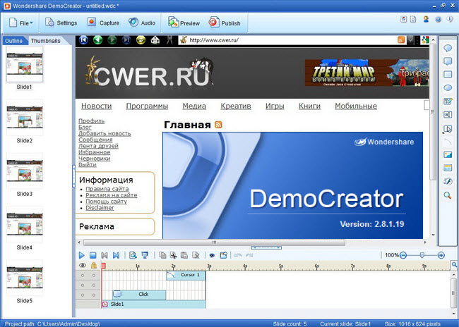 Wondershare DemoCreator - программное обеспечение для захвата экрана в целях создания, на основе Flash, обучающих руководств для прикладного программного обеспечения, обучения в режиме онлайн и презентаций продуктов в Интернет путём записи действий пользователя с экрана монитора. Программа настолько удобна, что отпадает надобность в познаниях программирования и в особенностях мультимедийных приложений. При помощи данной программы Вы значительно улучшите производительность изготовления презентаций и, вместе с тем, эффективность обучения представляемому программному обеспечению.