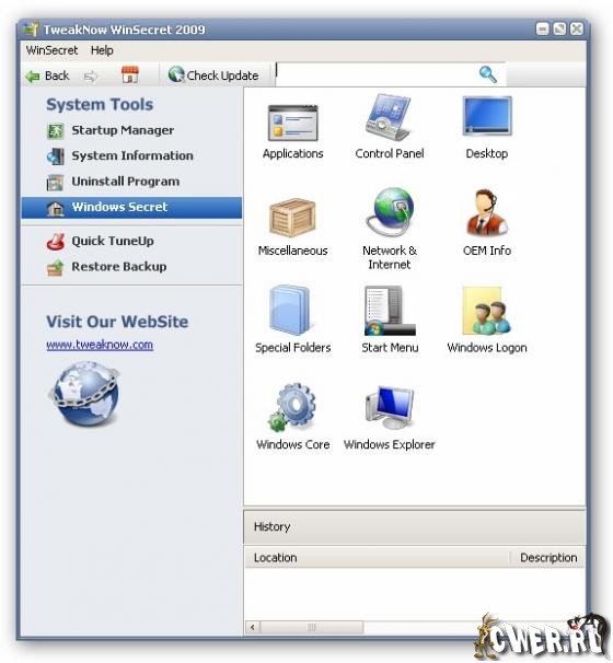 TweakNow WinSecret 2010 - утилита для тонкой настройки Windows. TweakNow WinSecret 2010 содержит наиболее востребованные параметры для изменения настроек операционных систем Windows XP/Vista/7. Все параметры разделены по категориям: приложения, панель управления, рабочий стол, сеть и Интернет, информация о компьютере, учетные записи пользователей, ядро Windows и различные другие настройки. Если работа программы приведет к нежелательным последствиям, то можно сделать откат, используя соответствующую функцию, что вернет все настройки на прежние.