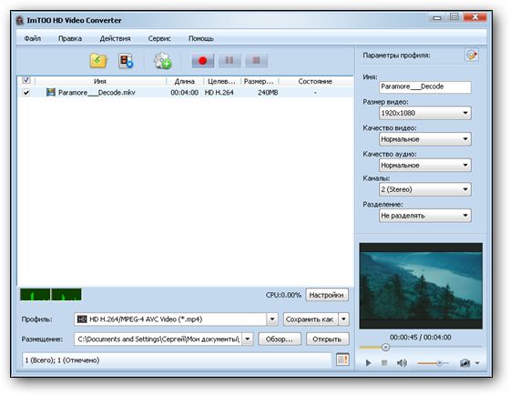- благодаря поддержке многоядерных процессоров, ImTOO HD Video Converter транскодирует HD видео быстрее, чем раньше.