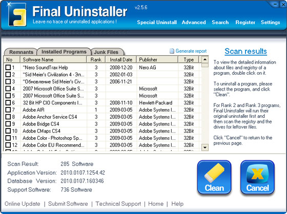 Final Uninstaller - программа позволяет очищать жесткий диск и системный реестр от мусора, оставшегося после удаления каких-либо программ. Программа использует высокоэффективный алгоритм обнаружения, который позволяет быстро просканировать систему и найти ненужные файлы и записи в системном реестре для каждой установленной программы на вашем компьютере. За несколько щелчков мыши программа просканирует ваш жесткий диск и реестр Windows, после чего предоставит вам список приложений, которые были неправильно деинсталлированы. После чего вы сможете выбрать приложения для последующего их полного удаления с компьютера. Программа имеет понятный пользовательский интерфейс и проста в использовании, поэтому подходит для любого пользователя.