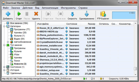 Download Master позволяет значительно повысить скорость закачки файлов через Интернет с использованием HTTP, HTTPS и FTP протоколов. Для этого используется разбиение файла на потоки, которые закачиваются одновременно. Программа также поддерживает докачку файла с текущей позиции после обрыва связи.