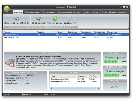 Ashampoo HDD Control - программное обеспечение для контроля за состоянием жестких дисков. Выполняет обслуживание жесткого диска для Вас. Позволяет предотвратить потенциальные отказы и аварии прежде, чем они произойдут. Программное обеспечение поддерживает жёсткие диски типа IDE и последовательные ATA. Ashampoo HDD Control предоставляет пользователю все важные факты и информацию о дисководе, включая регистрационный номер, версию БИОСА (прошивки), размер кэша, количество разделов, на которые разбит хард, свободном месте на диске и текущей температуре.