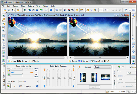 Advanced JPEG Compressor - одна из самых функциональных программ для сжатия изображений в формате JPEG. Возможно сжатие до 50% без потери качества. Программа обладает практически всем, что может только пожелать пользователь от программы для сжатия изображений. Главной особенностью программы является возможность просмотра сжатого изображения в режиме реального времени, т.е. вы увеличиваете или уменьшаете уровень компрессии, и картинка тут же изменяется. Таким образом, вы можете сразу увидеть результат...