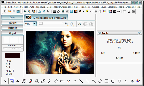 Focus Photoeditor - мощный и легкий в использовании редактор изображений, который вы сможете использовать для обработки и коррекции цифровых фотографий, а также для создания графики для ваших веб-сайтов, дома и офиса. Вы сможете получать фотографии с жесткого диска, другого приложения, а также с помощью сканера или фотокамеры и начинать их немедленную обработку в данном редакторе. В программе имеются функции для автоматического преобразования фотографий за один клик, благодаря чему вы сможете улучшить ваши фотографии за считанные секунды. Также вы сможете самостоятельно отредактировать внешний вид изображений при помощи встроенных в программу инструментов. Focus Photoeditor является неплохим выбором для новичка и для профессионального фотографа, т.к. в нем сочетаются множество качественных функций легких в использовании и настройке.