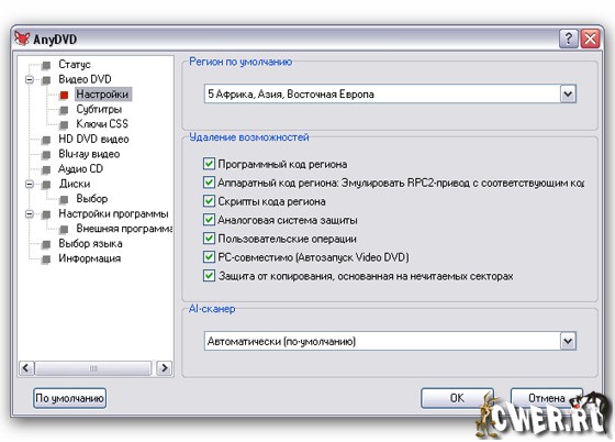 AnyDVD способен удалить нежелательные особенности фильмов, включая субтитры и запрещения, такие как авторское право и предупреждение ФБР. Также позволяет запускать внешнее приложение в момент перемещения диска или предотвратить автозапуск сторонних программ с диска DVD. Расшифровка не все на что способна AnyDVD. Вы можете управлять скоростью вашего DVD дисковода, чтобы снизить уровень шума при просмотре фильмов на компьютере. Вы даже можете настроить частоту отображения вашего монитора для NTSC и PAL дисплеев. AnyDVD не останавливается только на DVD. Она также расшифровывает защищенные аудио компакт-диски, позволяет вам копировать их.