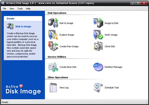 Программа Active@ Disk Image предназначена для создания и копирования образов жестких дисков. Это может быть полезно при копировании данных с компьютера на компьютер, а также в целях резервного копирования данных. Программа работает в чистом DOSe, то есть с загрузочной дискеты. Образ резервирования может быть сохранен на USB накопителе, сетевом хранилище, записан напрямую на CD/DVD/BR диски, или сохранено на других медиа носителях. Решение по резервированию данных для компьютера или любых компьютерных дисков, включая операционную систему, приложения и пользовательские файлы. В случае краха компьютера, резервный образ может использоваться для восстановления компьютерной системы или для поиска и восстановления любого нужного файла из образа.