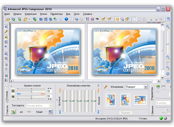 Advanced JPEG Compressor - одна из самых функциональных программ для сжатия изображений в формате JPEG. Возможно сжатие до 50% без потери качества. Программа обладает практически всем, что может только пожелать пользователь от программы для сжатия изображений. Главной особенностью программы является возможность просмотра сжатого изображения в режиме реального времени, т.е. вы увеличиваете или уменьшаете уровень компрессии, и картинка тут же изменяется. Таким образом, вы можете сразу увидеть результат.