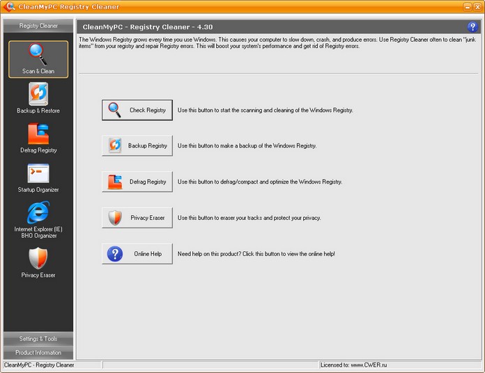 CleanMyPC Registry Cleaner сканирует системный реестр операционных систем Windows на предмет обнаружения и удаления некорректных, поврежденных или неработающих ссылок и записей. Данная процедура позволяет поддерживать работоспособность ОС на достаточно высоком уровне и избегать непредвиденных сбоев в работе ПК. Присутствует опция создания резервных копий реестра, так что вы всегда можете отменить все сделанные изменения и вернуться к наилучшей конфигурации. Также утилита позволяет с легкостью управлять программами и BHO (Browser Helping Object), автоматически загружаемыми в момент запуска Windows и Internet Explorer.