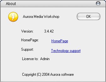 Aurora Media Workshop - набор инструментов для выполнения всех основных операций с видеофайлами - резки, склейки, конвертирования в другой формат, сохранения кадра в отдельный графический файл и т.п. Позволяет конвертировать медиафайлы (AVI, MPEG1, MPEG2, ASF, WMV, VOB, DAT , DivX, Xvid), производить риппинг аудиотреков, а также записывать с внешних источников. Кроме этого, с помощью Aurora Media Workshop можно записывать Audio CD, Data CD/DVD, Video CD и сохранять собранный образ отдельным ISO-файлом. Для поддержки WMA-формата требуется установленный Windows Media Encoder 9 или выше.
