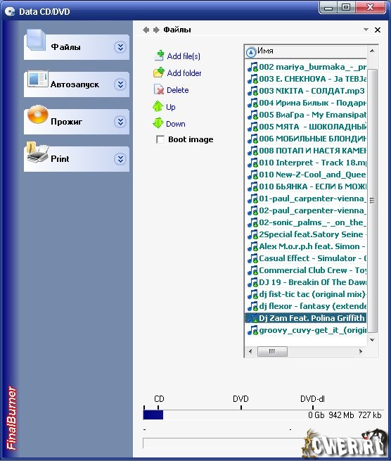 - Запись MP3 аудио дисков (*.wav; *.ogg; *.mid; *.wma и т.д.)
