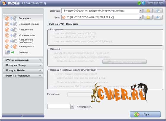 DVDFab – мощный, многофункциональный программный продукт для копирования DVD дисков с возможностями гибкой обработки видеопотока. Программа является одной из лучших на сегодняшний день, из инструментов для копирования, разбиения, пережатия и конвертирования DVD дисков с фильмами. Снимает все защиты и ограничения с диска и при желании пережмет диск большой емкости и вместит его в обыкновенную пустую DVD болванку с минимальными потерями качества (DVD9->DVD5) или разобъет фильм на два диска с полным переносом его меню, удалит всю рекламу, запишет только фильм и многое другое. Программа имеет интуитивно понятный, мультиязычный интерфейс включая русский.