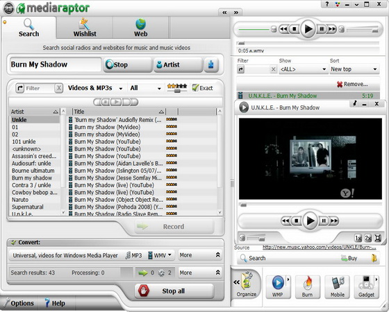 Mediaraptor является мощным аудио и видео-поисковым инструментом, который позволяет найти, музыкальные треки и видео клипы из разных интернет-радиостанций и других источников. Вы можете осуществить поиск по названию или по имени исполнителя, найти новую музыку по жанру и автоматически записывать потоковое медиа во время поиска на YouTube, Google Video и других подобных сайтах. Другие функции включают комплексные средства конвертирования, редактирования ID3 тегов, записи файлов на CD диск и многое другое.