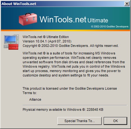 WinTools.net Ultimate – набор инструментов для оптимизации операционной системы Windows. В состав программы входят компоненты для полного удаления нежелательных программ и «мертвых» ссылок реестра, а также для контролирования процессов, настройки системы, интернет-соединений и интерфейса. В состав программы входят следующие инструменты: Clean Uninstaller, Scan Files, Scan Shortcuts, Scan Registry, Startup Manager, Tweak UI, Net Tweaker, The Privacy, Invisible Man, File Shredder. Кроме того, имеются утилиты для надежного хранения конфиденциальной информации.