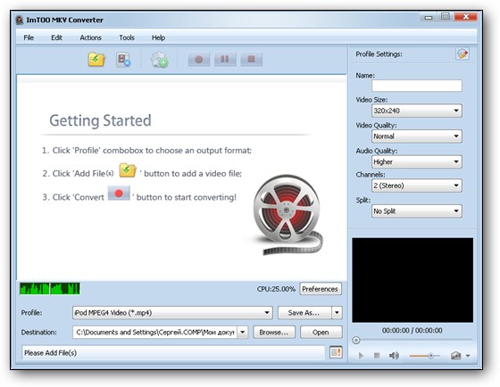 ImTOO MKV Converter - конвертер MKV файлов в другие видео форматы, поддержка AVI, WMV, DivX, MP4, H.264/AVC, XviD, MOV, MCE AVI и других форматов, извлечение аудио в MP3, WAV, WMA, AAC, M4A и другие аудио форматы, поддержка пакетного режима работы, предварительный просмотр результата, выбор и настройка кодеков, выбор и настройка параметров конвертирования, поддержка iPod, PSP, Apple TV, PS3, Xbox и других мобильных устройств.