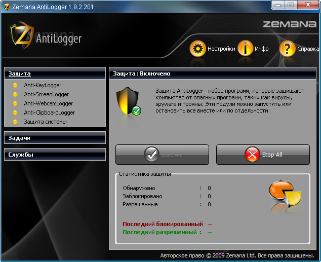 Zemana AntiLogger - мощный программный комплекс для защиты вашего ПК от наиболее опасных сетевых угроз, таких как KeyLoggers, ScreenLoggers, WebCamLoggers, ClipboardLoggers. Помимо обеспечения безопасности от вышеуказанных вредоносных программ, программа защищает доверенные компоненты системы от нежелательного доступа, например, инжекция dll/code, загрузка драйвера ядра, изменение физической памяти и т.д. Программа совместима со всеми популярными антивирусами и совершенно не влияет на производительность системы.