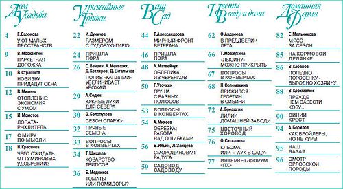В номере: малые архитектурные формы в саду, паркетная дорожка, устанавливаем новые окна, как сэкономить на отоплении, лопата-рыхлитель, преимущества капельного полива, о сельдерее, спарже, помидорах, облепихе, груше, смородине, снова об обрезке, цветы и домашняя живность - эти и другие темы нашли свое отражение в очередном номере журнала.