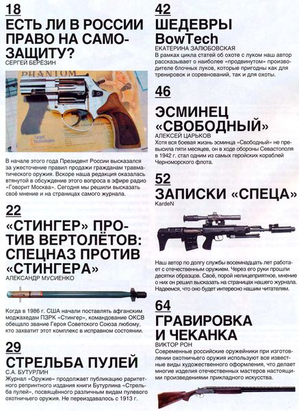 Издание адресовано широкому кругу читателей, интересующихся стрелковым, охотничьим и холодным оружием. В каждом номере - достоверная и авторитетная информация о разработках, выпускаемых образцах, производителях и конструкторах оружия. Основное внимание уделено современным отечественным и зарубежным моделям, эволюции видов и образцов стрелкового оружия. Ряд страниц журнала посвящен оружию и специальным средствам правоохранительных органов.