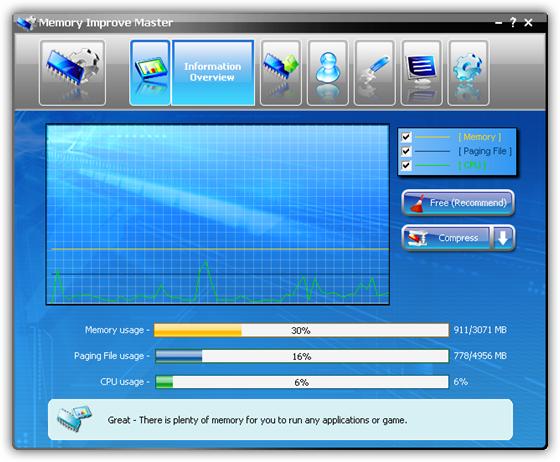 Memory Improve Master - позволяет увеличить быстродействие вашего компьютера за счет освобождения (дефрагментации) оперативной памяти. Имеется возможность установки минимального количества свободной оперативной памяти, при превышении которого запустится модуль и попытается удалить из оперативной памяти лишние процессы. Кроме этого, есть возможность просмотра запущенных процессов, наблюдение за нагрузкой на ЦП и множество других полезных настроек.