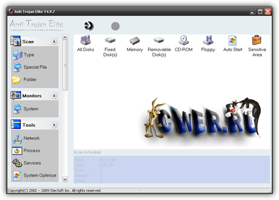 Anti-Trojan Elite - программа для очистки компьютера от таких вредоносных файлов, как трояны, кейлогеры и прочее. Сканирует не только жесткий диск (включая архивы ZIP CAB), но и смотрит на то, какие процессы запущены. Также располагает менеджером сетевых процессов, при помощи которого можно определить, где запущен нежелательный процесс. Кроме этого, вы можете просмотреть ключи и значения реестра и удалить подозрительные, починить Internet Explorer, оптимизировать работу Windows и многое другое. Помимо этого, в состав программы входят утилиты для блокирования подозрительных TCP-соединений и процессов, а также для исправлений ошибок в реестре, вызванных деятельностью вредоносных программ.