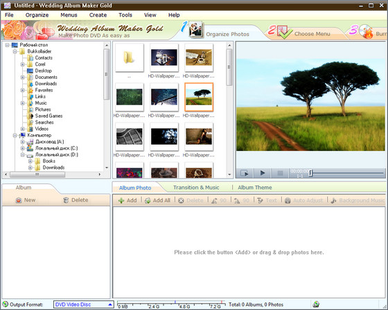 Wedding Album Maker Gold – это профессиональная программа фотоальбома, которая создает впечатляющее слайд шоу из свадебных фотографий с музыкой, переходами и DVD меню. Данная программа позволяет быстро и легко создать впечатляющие свадебные альбомы на DVD видео диски, чтобы поделиться своей историей любви по свадьбе с другими людьми. Новая версия поддерживает больше выводных форматов, такие как: MPEGI, MPEGII, MPEG-4, MP4 for iPod, PSP, 3GP сотовые телефоны, FLV , XVid AVI, AVI, видео форматы для Anrchos, Creative Zen Vision, iRiver PMP 100, YouTube, MySpace.