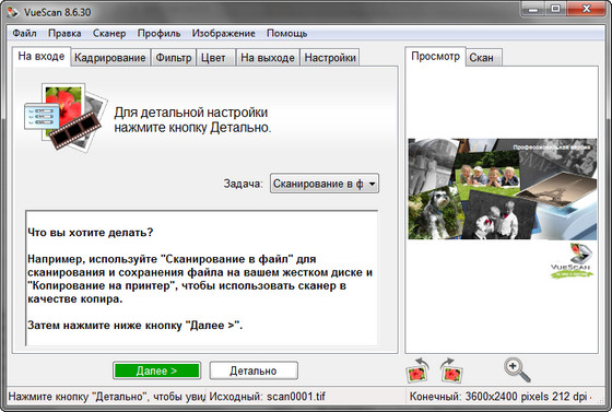 VueScan Pro - программа для работы со сканерами HP, Minolta, Nikon, Polaroid, Epson, Canon и другими. Может работать с внутренней глубиной цвета. VueScan поддерживает автоматическую и ручную настройку большинства параметров и пакетный режим сканирования. Поддерживается более 500 моделей сканеров с определенным перевесом в сторону слайд-сканеров — Nikon, Minolta, Polaroid, Microtek, Epson. Предусмотрено автоматическое удаление дефектов изображения за счет канала инфракрасного сканирования и многопроходное сканирование с последующим усреднением результата — для подавления собственных шумов сканера. Имеются фильтры подавления зерна, нерезкого маскирования и удаления паразитного оттенка оригинала. Есть средства ручной корректировки динамического диапазона и градационной характеристики (независимо по каналам R, G, B).
