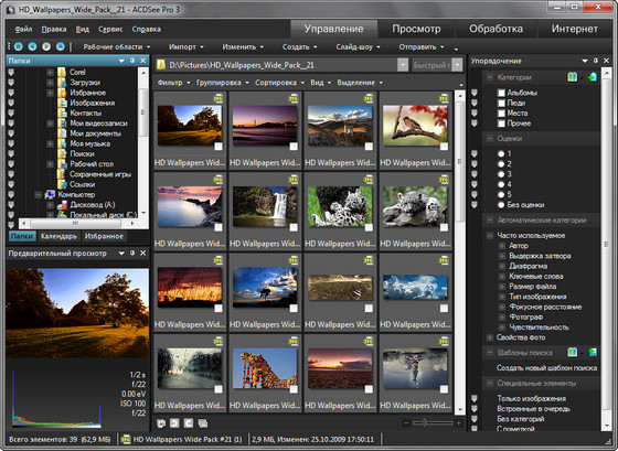 ACDSee Pro - профессиональная программа для работы с цифровыми фотографиями, которая обладает расширенным набором функций, рассчитанных на профессиональных фотографов. Поддерживает более 100 форматов графических файлов, позволяет работать с RAW-изображениями, автоматически сортировать фотографии по параметрам, полученным из цифровых фотокамер, содержит эффективный визуальный метод добавления к изображениям метатегов и быструю пакетную обработку большого количества картинок, в том числе и в RAW формате. Кроме того, здесь присутствуют инструменты для независимого регулирования цветовых каналов, исправления артефактов фотографий, появляющихся из-за погрешностей оптики, добавления "водяных знаков", работы с IPTC-метаданными, имеется возможность архивирования графических коллекций в ZIP-файлы, запись на CD или DVD и многое другое.