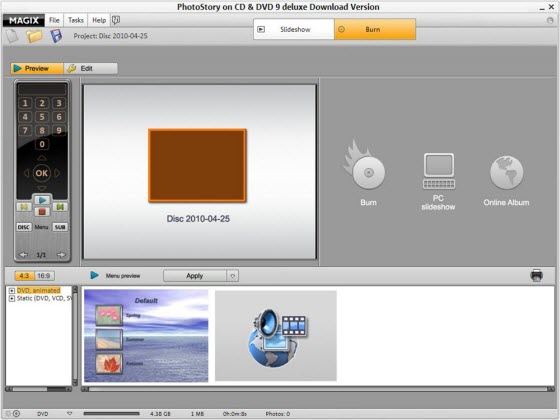 MAGIX Xtreme Photostory on CD & DVD Deluxe - программа для записи коллекции фотографий на CD и DVD диски для их последующего просмотра на экране вашего телевизора. Программа позволит вам преобразовывать ваши фотографии и видео в незабываемые слайдшоу с потрясающими переходами, звуковым сопровождением и т.д. Вы сможете добавлять на фотографии и видео различные эффекты, переходы, профессиональные фильтры, заголовки, музыку и многое другое. Создание слайдшоу происходит всего за несколько нетрудных шагов. Сначала вы должны импортировать фотографии и видео, после чего отредактировать их, накладывая эффекты, текст, переходы и фильтры, и в заключение записать готовый результат на CD или DVD диск. Программа содержит в себе различные шаблоны для быстрого создания ваших проектов.