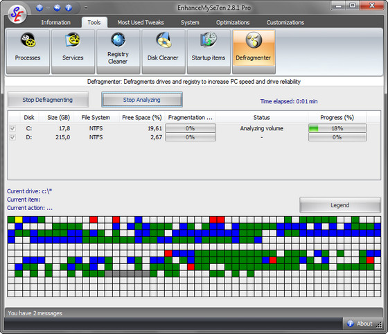 EnhanceMySe7en включает в себя менджер автозагрузки, менеджер процессов, модуль очистки жесткого диска, дефрагментатор жесткого диска, "чистильщик" системного реестра, монитор жесткого диска (температура, время работы, серийный номер и т.п.), модуль настройки интернет-соединения, а также средства для быстрого доступа к "тонким" настройкам операционной системы.