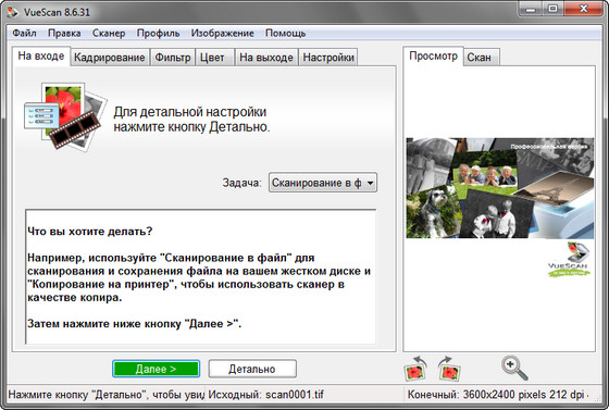 VueScan Pro - программа для работы со сканерами HP, Minolta, Nikon, Polaroid, Epson, Canon и другими. Может работать с внутренней глубиной цвета. VueScan поддерживает автоматическую и ручную настройку большинства параметров и пакетный режим сканирования. Поддерживается более 500 моделей сканеров с определенным перевесом в сторону слайд-сканеров — Nikon, Minolta, Polaroid, Microtek, Epson. Предусмотрено автоматическое удаление дефектов изображения за счет канала инфракрасного сканирования и многопроходное сканирование с последующим усреднением результата — для подавления собственных шумов сканера. Имеются фильтры подавления зерна, нерезкого маскирования и удаления паразитного оттенка оригинала. Есть средства ручной корректировки динамического диапазона и градационной характеристики (независимо по каналам R, G, B).