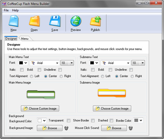 Now you can create Flash Menus for your Website quickly and easily. Each item is a button that, when clicked, will display a submenu that you can link to different parts of your Website. Use the provided buttons or choose your own to customize the menu to fit your Website. There are so many different choices for customizing the look of your menu. Choose from font styles and sizes to background colors and sounds. Give your users something they can interact with using CoffeeCup Flash Menu Builder.