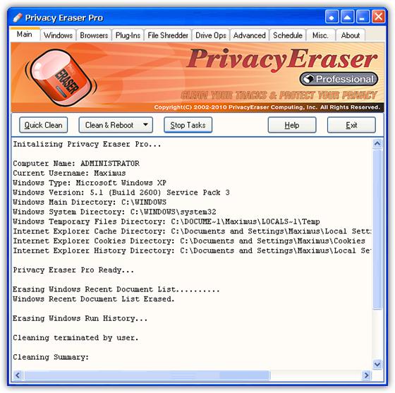 Privacy Eraser Pro - программа для очистки следов пребывания в интернете для таких браузеров: Internet Explorer, Mozilla Firefox, Google Chrome, AOL, Opera and MSN Explorer. А также поддерживает более 250 плагинов для очистки следов приложений, таких как: ACDSee, Acrobat, Microsoft Office, KaZaA, Real Player, Media Player и т.д.