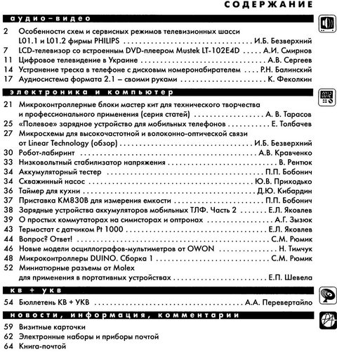 Основные разделы журнала: аудио, видео, электроника, компьютер, КВ и УКВ радиосвязь, современные телекоммуникации.
