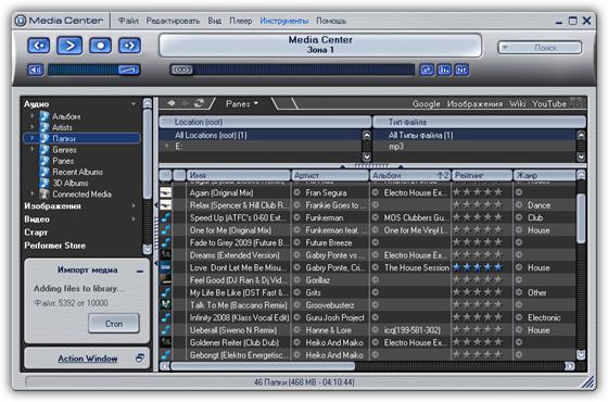 J.River Media Center - мультимедийный центр. Проигрывает большинство популярных аудио и видео форматов, включая MP3, аудио CD и DVD, может преобразовывать CD-аудиотреки в WAV и MP3, переписывать на жесткий диск виниловые диски и кассеты, а также создавать аудио-CD, причем для всех этих функций программа имеет множество настраиваемых параметров. Кроме этого, есть очень хороший и мощный по своим возможностям органайзер мультимедийных файлов, медиаредактор, эквалайзер, встроенный DSP и удобный планировщик заданий для автоматизации процессов проигрывания/записи, а также поддержка пульта ДУ. Из необязательных, но приятных функций - становящаяся уже почти стандартом для "приличных" программ возможность изменения внешнего вида с помощью скинов, мини-режим проигрывателя и "телевизор".