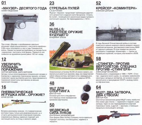 Издание адресовано широкому кругу читателей, интересующихся стрелковым, охотничьим и холодным оружием. В каждом номере - достоверная и авторитетная информация о разработках, выпускаемых образцах, производителях и конструкторах оружия. Основное внимание уделено современным отечественным и зарубежным моделям, эволюции видов и образцов стрелкового оружия. Ряд страниц журнала посвящен оружию и специальным средствам правоохранительных органов.