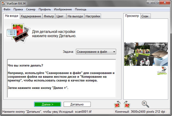 VueScan Pro - программа для работы со сканерами HP, Minolta, Nikon, Polaroid, Epson, Canon и другими. Может работать с внутренней глубиной цвета. VueScan поддерживает автоматическую и ручную настройку большинства параметров и пакетный режим сканирования. Поддерживается более 500 моделей сканеров с определенным перевесом в сторону слайд-сканеров — Nikon, Minolta, Polaroid, Microtek, Epson. Предусмотрено автоматическое удаление дефектов изображения за счет канала инфракрасного сканирования и многопроходное сканирование с последующим усреднением результата — для подавления собственных шумов сканера. Имеются фильтры подавления зерна, нерезкого маскирования и удаления паразитного оттенка оригинала. Есть средства ручной корректировки динамического диапазона и градационной характеристики (независимо по каналам R, G, B).