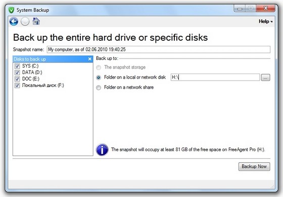 Выбирайте тома для резервного копирования