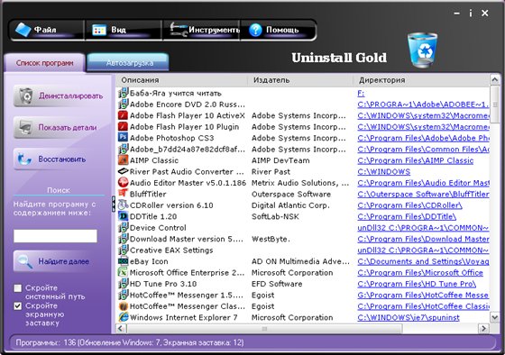 Uninstall Gold - удобная и небольшая по размеру утилита для быстрого и качественного удаления установленных ранее приложений. Программа обладает большим количеством функций: показывает скрытые установленные программы, сортировка программного обеспечения по заданному фильтру, удаление некорректно установленных и деинсталлированных программ.