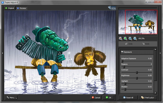 Topaz Adjust - плагин для Adobe Photoshop с возможностью предпросмотра возможных результатов обработки изображения. Используя передовые алгоритмы для регулировки таких параметров, как цвет, детализация, экспозиция, шумоподавление, размытие, яркость , контраст и других, эффективно поможет достигнуть уникальных результатов в обработке фотографий, создать высокохудожественные картины из Ваших фотографий с минимальной потерей времени и сил. Совместим со всеми версиями Adobe Photoshop и многими другими графическими редакторами.